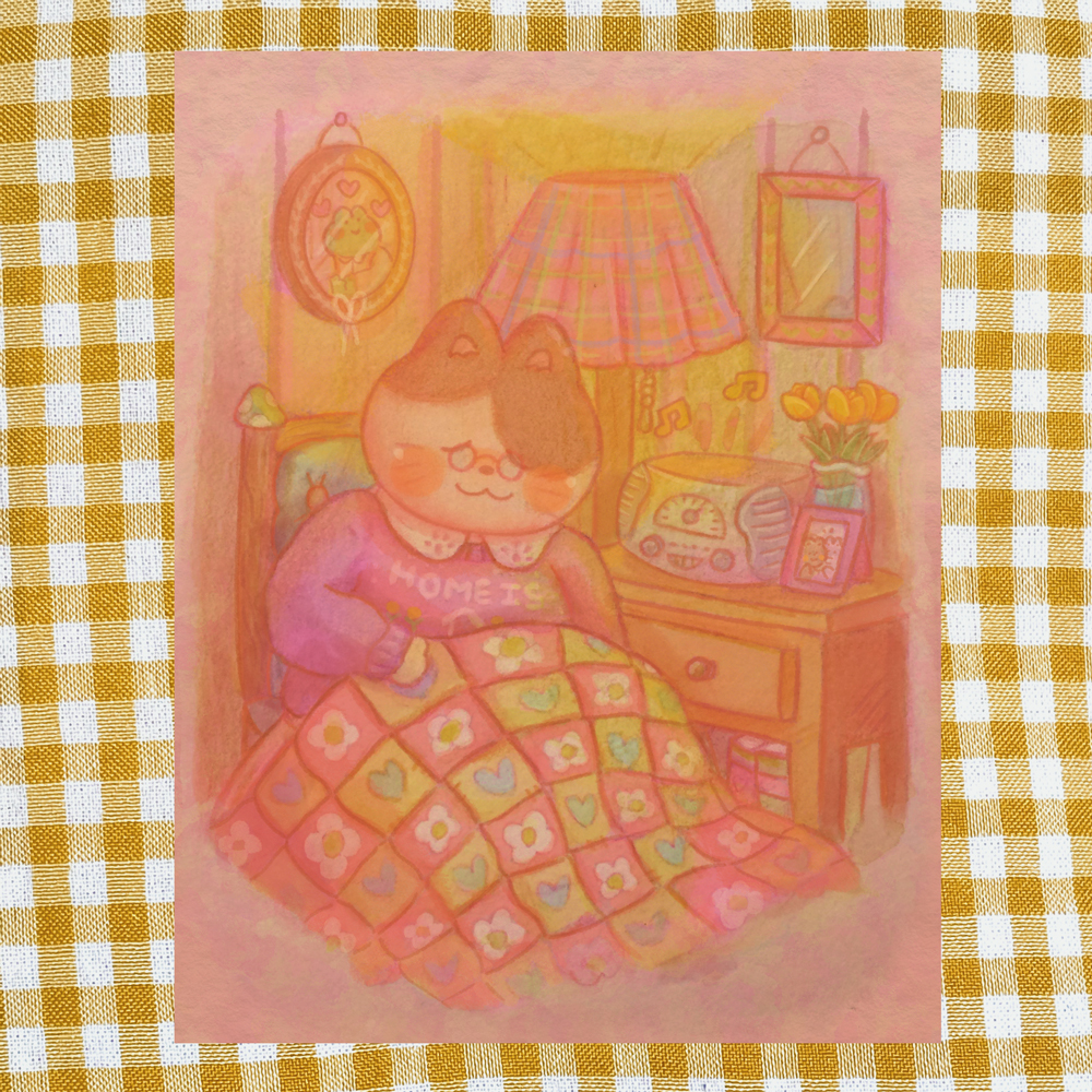 8.5 x 11 Print Little kitty quilting a cozy little blanket. but she prob is falling asleep